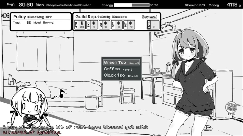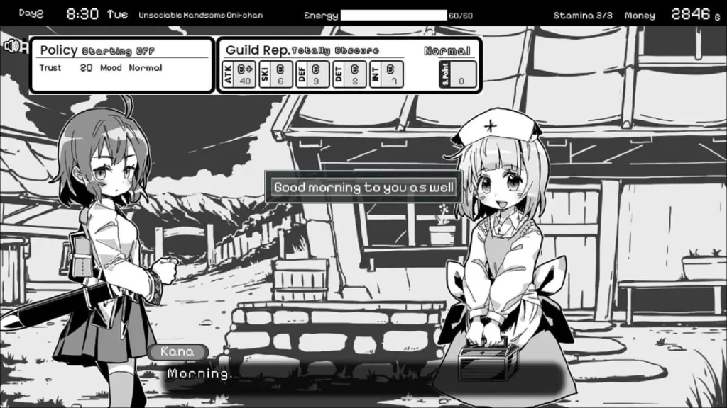 The core loop here is beautifully familiar to life sim fans: your days are split between earning resources and nurturing your relationship. You’ll spend mornings and afternoons on guild quests to build your stats and fill your purse, then evenings at home managing your sister’s well-being and, if you play your cards right, deepening your bond through careful nighttime interactions Monochrome Fantasy is famous for. It’s a tightrope walk of resource management, and falling off means missing out on the heart of this charming adventure.